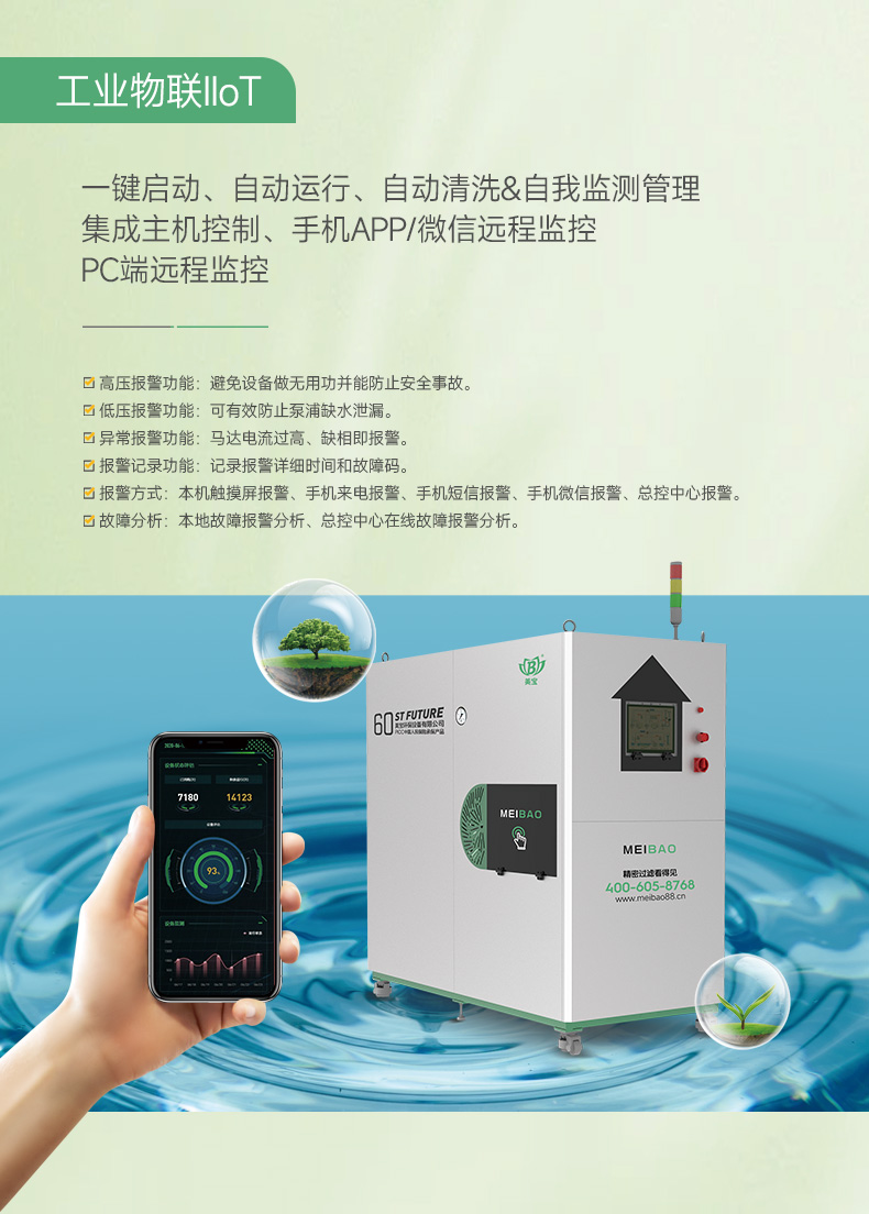 五、省空間:采用模塊組合方式,過(guò)濾模塊和清洗模塊分開(kāi),縮小了過(guò)濾模塊體積,給客戶(hù)節(jié)省很大空間:六、省成本: 1+N組合一個(gè)清洗模塊 +多個(gè)過(guò)模塊組合,組合過(guò)模塊越多越省成本(前可1+20組合)七、遠(yuǎn)程通信: 手機(jī)或電腦APP客戶(hù)端遠(yuǎn)程操作和監(jiān)控,及微信和短信報(bào)警提醒;